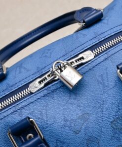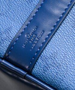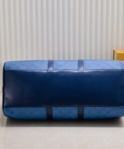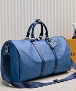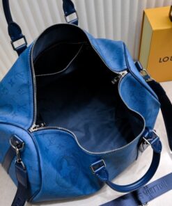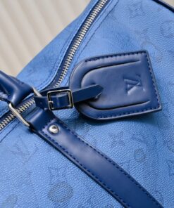 Travel in style with the Louis Vuitton Keepall Bandoulière 50. This 19.7-inch weekend bag is crafted from durable Monogram Aquagarden coated canvas and premium leather, offering a massive capacity for airport fashion or weekend getaways. With its striking Navy River Blue design and adjustable jacquard strap, it combines high-fashion aesthetics with rugged durability for the ultimate luxury travel experience.