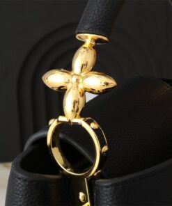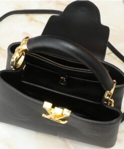 Elevate your wardrobe with the Louis Vuitton Capucines BB in Black Taurillon leather. Measuring 26.5 x 17.5 x 9 cm, this iconic top-handle bag offers a structured silhouette and durable cowhide lining, perfect for upscale dinners, office commutes, or weekend brunch. Featuring gold-color hardware and a versatile double-carry flap, it effortlessly fits two smartphones and a wallet, blending high-fashion style with daily functionality.