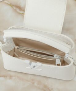 If there is one bag that defines “quiet luxury” with a modern architectural twist, it’s the Louis Vuitton Capucines East-West Mini in Optic White. This isn’t just a handbag; it’s a mood. The elongated “East-West” silhouette takes the classic Capucines DNA and stretches it into a sleeker, more contemporary form that feels fresh and incredibly high-fashion.