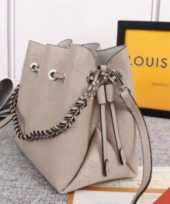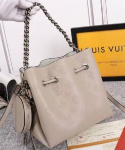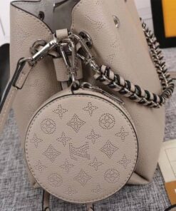 The Mahina Bella Bag in Galet Gray is a masterclass in understated luxury. Crafted from buttery-soft Mahina calf leather, this bucket bag features the iconic Louis Vuitton perforated Monogram pattern, offering a texture that is as tactile as it is visual. Its compact silhouette is perfectly complemented by a matching round coin purse, creating a look that is effortlessly modern and undeniably chic.